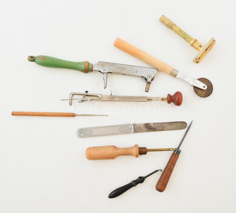 9 darab régi eszköz, közte Solingen levélbontó, Gilette borotva https://www.darabanth.com/hu/446-Gyorsarveres/446.0/Mutargy-papirregiseg-egyeb/Bolhapiac~500014/9-darab-regi-eszkoz-kozte-Solingen-levelbonto-Gilette-borotva~II2948158