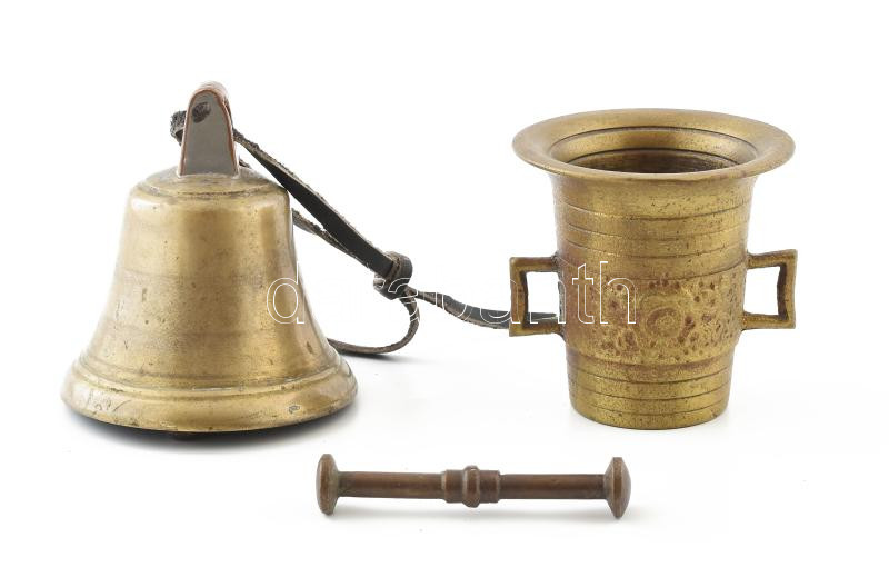 Leírás: Antik bronz mozsár m: 7 cm + törő h: 7,5 cm + kolomp m: 8,5 cm