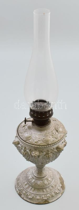 Leírás: Antik petróleumlámpa, festett spiáter testtel, felragasztott üvegbetéttel, szép állapotban, m: 47,5 cm