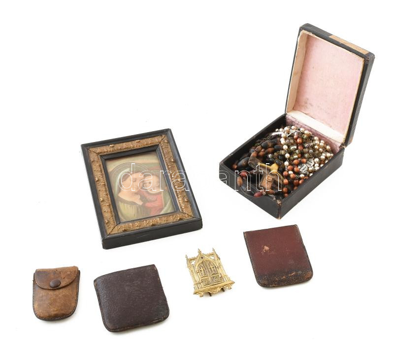 Leírás: Antik vallásos tárgy tétel, közte értékesebb darabokkal, 5 rózsafüzér, rózsafüzértartó tokok, kinyitható támasztható szentmutató, keretezett vallásos nyomat