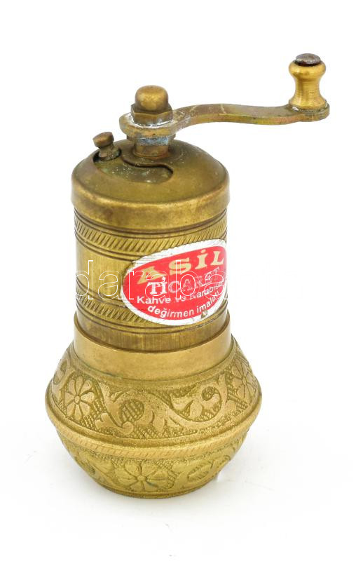 Leírás: Díszes réz borsörlő, jelzéssel, szép állapotban, m: 10,5 cm