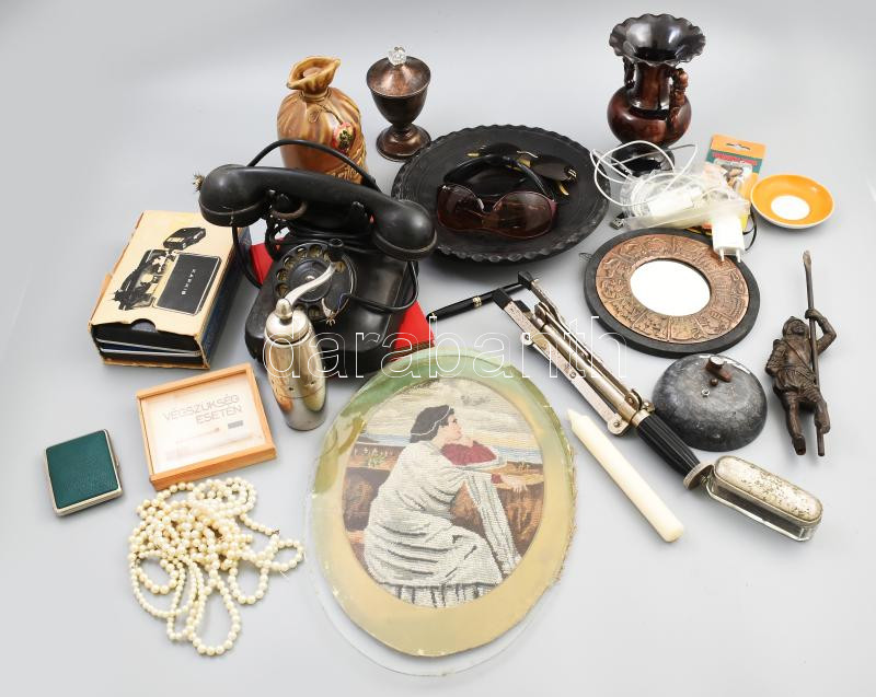 Egy doboznyi minőségi bolhapiac tétel, közte vonalas tárcsás telefon, iparművész váza, tükör, borsdaráló, fényképezőgép állvány, albumnyi bélyeg, szemüvegek, goblein, borotva, falitál, stb., különböző méretben és állapotban, garancia nincs! KIZÁRÓLAG SZEMÉLYES ÁTVÉTEL, NEM POSTÁZZUK! / ONLYPERSONAL COLLECTION AT OUR OFFICE!