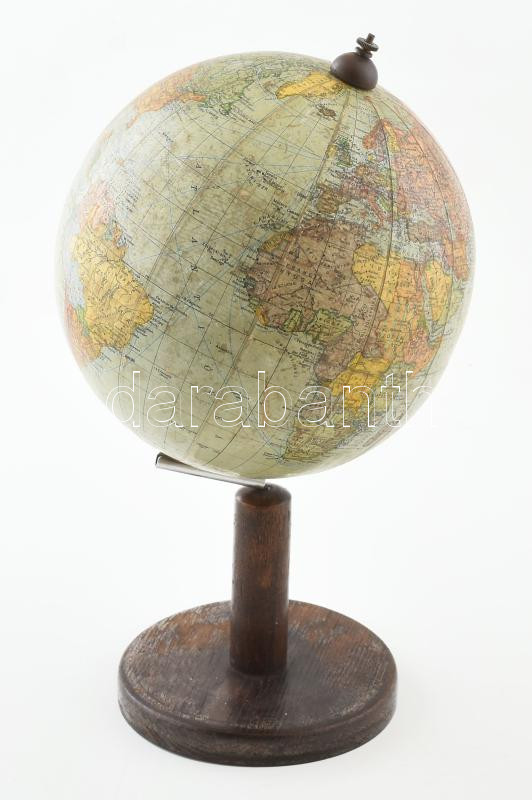 Földgömb, 1950-60 körül, 1:63.000.000, készítette Fővárosi Neon Földrajzi Tanszerosztálya, Offset Nyomda, Bp., fa talapzaton, fém szerelékkel, d: 20 cm, m: 36 cm, kopott, apró felületi sérülésekkel,