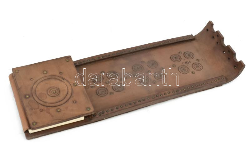 Leírás: Iparművész bőr tolltartó, hozzá tartozó jegyzettömbbel, szép állapotban, 30x10 cm