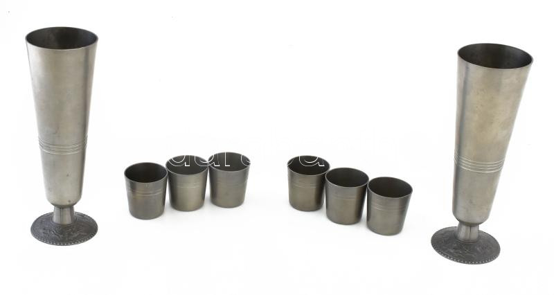 Leírás: Ón serleg pár m: 20 cm + ón pálinkás kupica szett, 6 db, m: 4,5 cm, jelzéssel, kopással