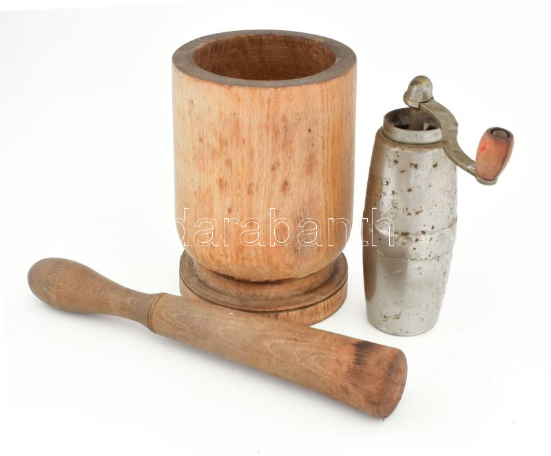Leírás: Régi famozsár, m: 16 cm, törővel h: 25 cm + fém borsdaráló jelzéssel, m: 16 cm