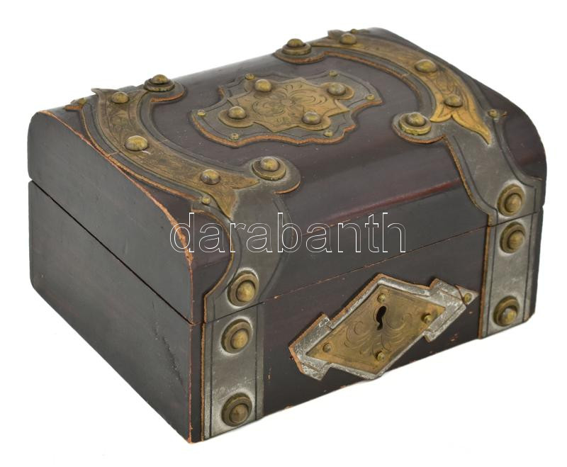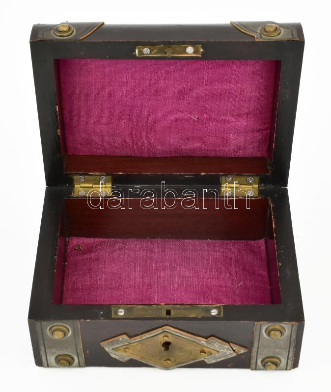 Leírás: Régi fémveretekkel díszített ékszeres doboz, bélelt, kulcs nélkül, szép állapotban, 13x9,5x7 cm