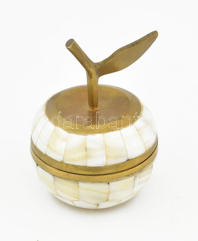 Leírás: Retro iparművész által készített réz ékszertartó, gyöngyház berakásokkal, szétcsavarható, jelzés nélkül, m: 10 cm
