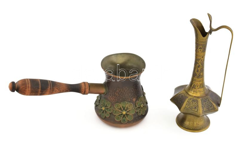 Leírás: Réz kávékiöntő fa nyéllel 24 cm + keleti mintás réz kannácska 20 cm