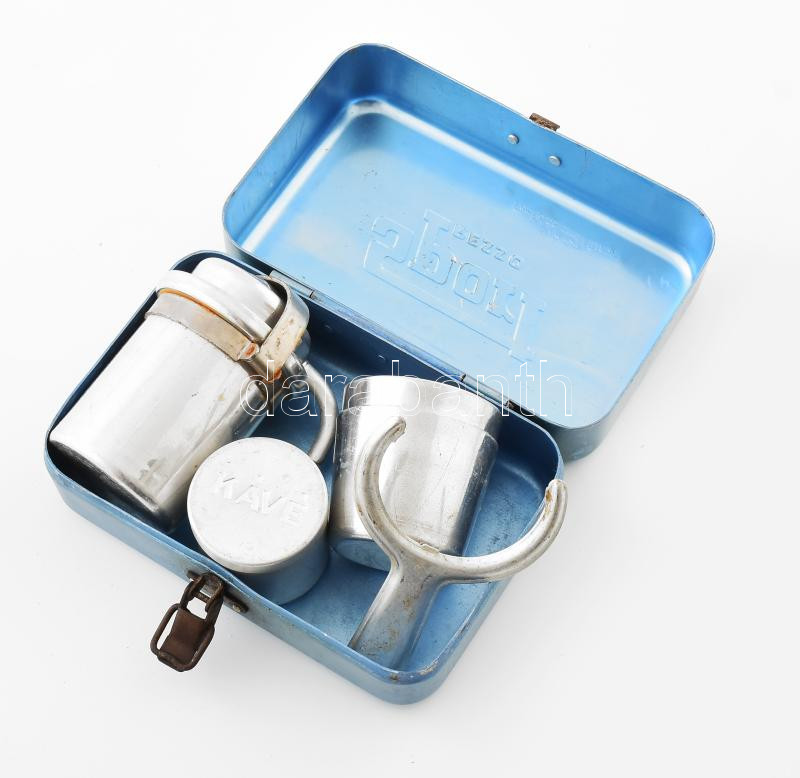 Sport Presso retró kávéfőző készlet, kétszemélyes, kis hiányossággal. Gyártja: Fémfeldolgozó Vállalat, Szeged. Fém, eredeti dobozában, korának megfelelő állapotban, 14x9x6,5 cm