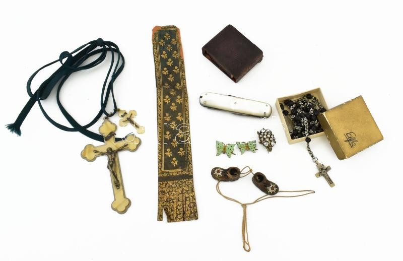 Leírás: Vegyes minőségi bolha tétel: Gyöngyház berakásos bicska, tűzzománcos lepke medál pár, antik feszületek, antik bőr könyvjelző, régi gyufatartó, rózsafüzér, kövekkel díszített teknős medál