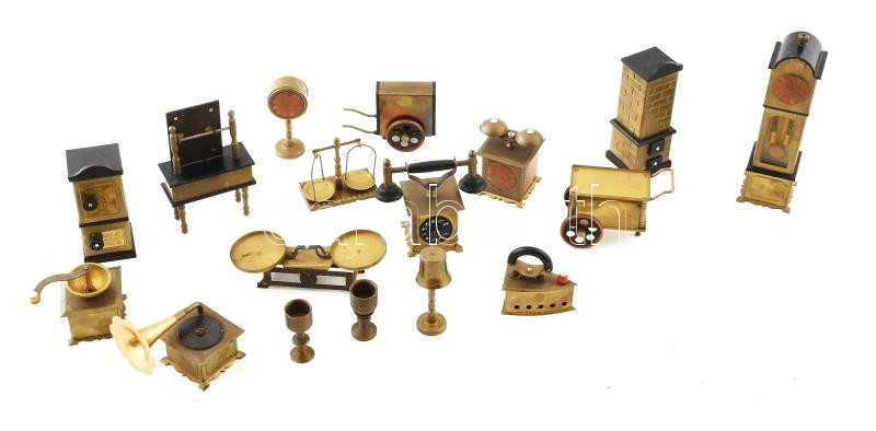 Leírás: cca 18 darabos makett tárgy tétel, szép állapotban. Óra, vasaló, mérleg, telefon, zsúrkocsi, kályha, stb.
