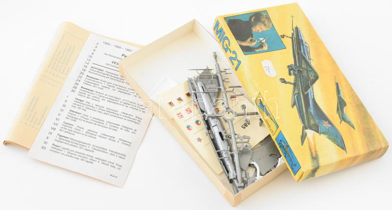 Leírás: 1987 MiG-21 repülőgép-modell, eredeti dobozában, német nyelvű útmutatóval