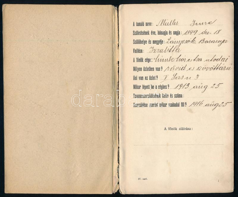 1915 Ellenőrző könyv izraelita vallású személy részére https://www.darabanth.com/hu/446-Gyorsarveres/446.0/Mutargy-papirregiseg-egyeb/Judaika~500027/1915-Ellenorzo-konyv-izraelita-vallasu-szemely-reszere~II2948597