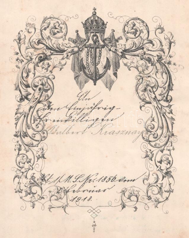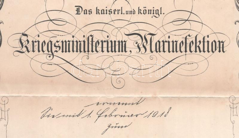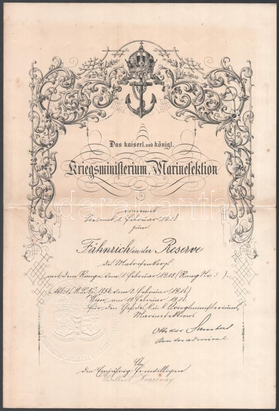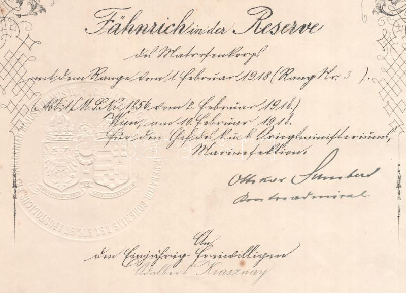 Commission, issued by the Navy Section of the Imperial and Royal War Ministry, to One-Year Volunteer Adalbert Krasznay (German version of Béla Krasznai), as a Reserve Ensign (Fähnrich), signed by Rear Admiral Ottokar Schubert (b .1865, in the service since July 1, 1883, promoted to rear admiral on May 5, 1916). 28x40 cm