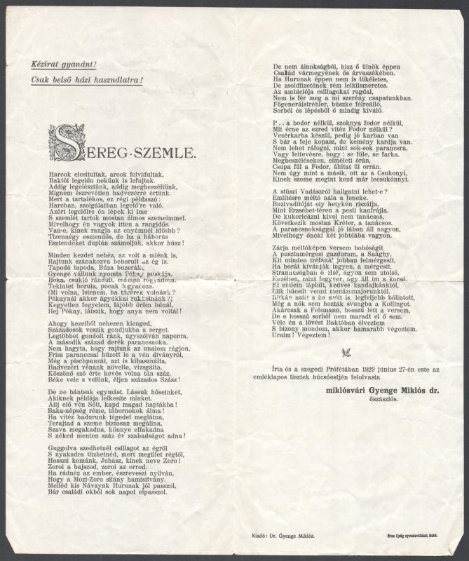 1929 Dr. Gyenge Miklós (1893-1985) Sereg-szemle c. versének nyomtatván... https://www.darabanth.com/hu/446-Gyorsarveres/446.0/Mutargy-papirregiseg-egyeb/Militaria~1000001/1929-Dr-Gyenge-Miklos-1893-1985-Sereg-szemle-c-versenek-nyomtatvanya-hatoldalan-a-szerzo-~II2954199