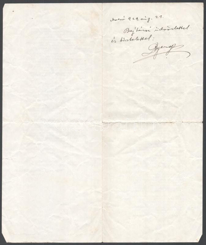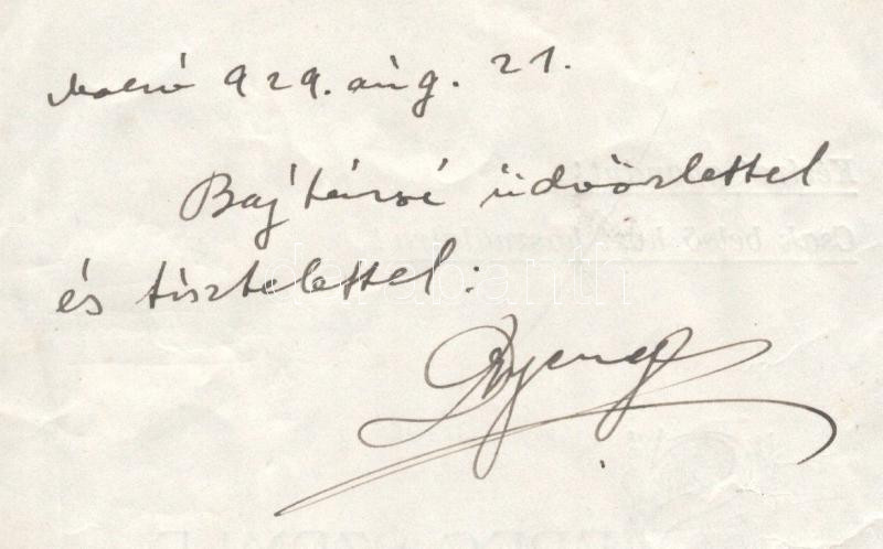 Leírás: 1929 Dr. Gyenge Miklós (1893-1985) Sereg-szemle c. versének nyomtatványa, hátoldalán a szerző saját kezű üdvözletével és aláírásával