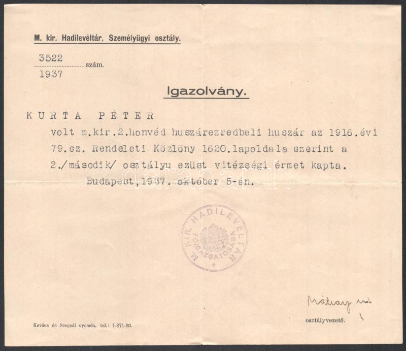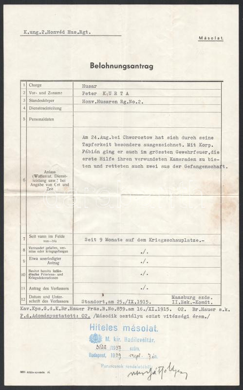 1937 Bp., A M. kir. hadilevéltár Személyügyi osztályának igazolványa a 2. osztályú ezüst vitézségi érem adományozásáról (1916), M. Kir. Hadilevéltár főigazgatósága bélyegzéssel + 1939 Kivonat a Királyi Magyar 2. Honvéd Huszárezred hadi naplójából (1915), a kitüntetés okául szolgáló hadi cselekmény német nyelvű leírásával