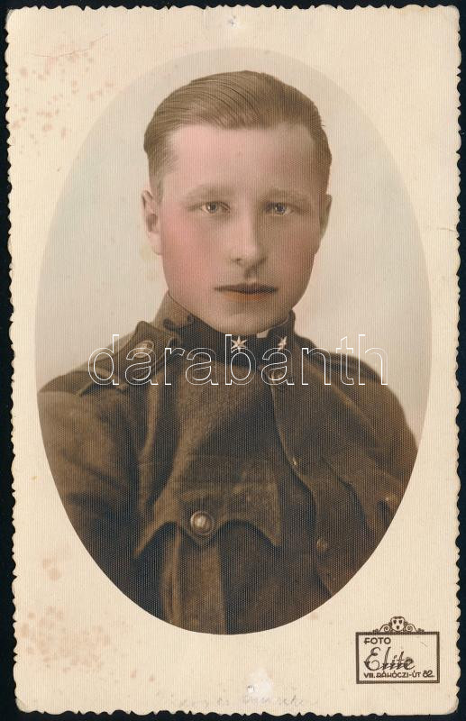 Leírás: Katona színezett portréja, fotó (Foto Elite), foltos, felületén törésnyomok, 13×9 cm