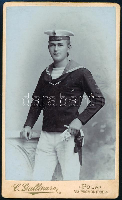 cca 1890 Az S.M.S. Fasana ( Gamma) lapos fenekű bárka matróza. Vizitkártya. / Sailor of the sloop S.M.S. Fasana ( Gamma) in Pola. cdv photo by Cesare Gallinaro Pola. 6x9 cm