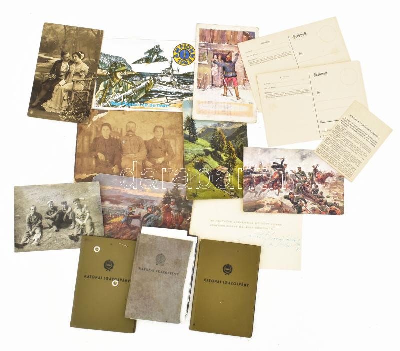 Leírás: cca 1914-1973 Vegyes katonai tétel, fotók, képeslapok igazolványok, régiek és modernek, változó állapotban, közte sérült is.