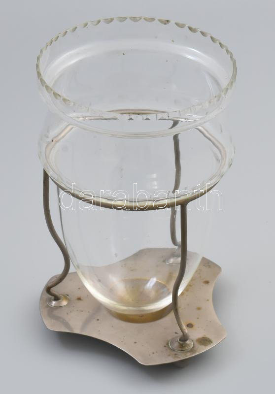Leírás: Antik ezüstözött bronz üvegbetétes szőlőmosó, kopásokkal, jelzés nélkül, d: 12 cm, m: 20 cm