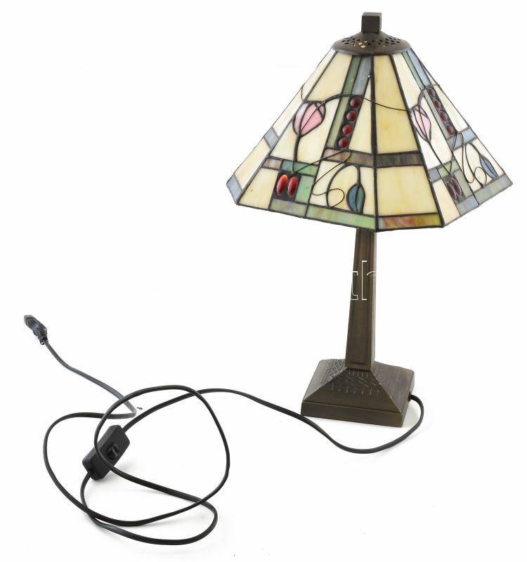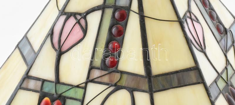 Leírás: Tiffany jellegű asztali lámpa, díszes ólomüveg búrával, szép állapotban, m: 43 cm