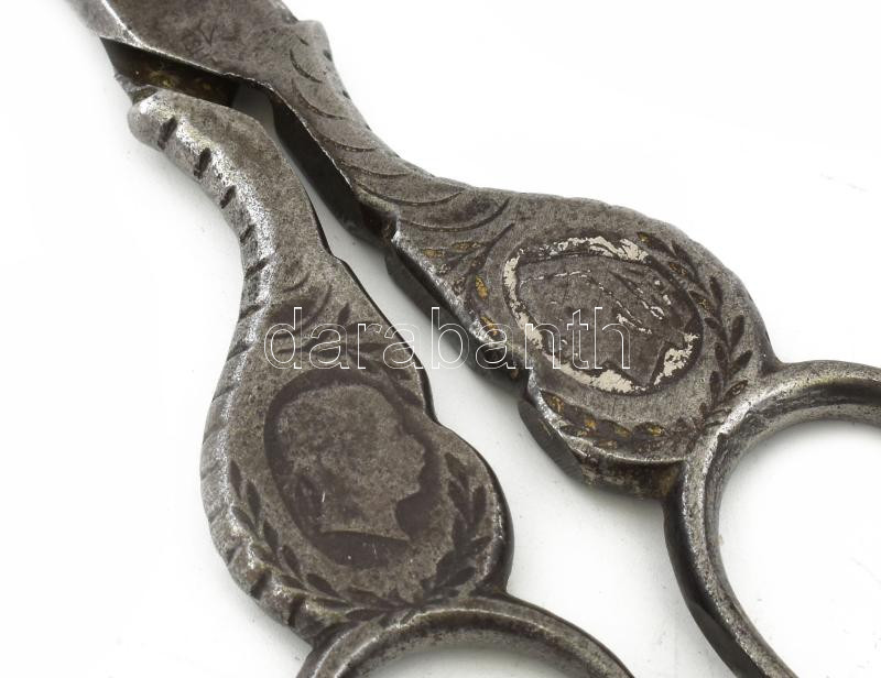 Leírás: XIX. sz. vége. Antik papírvágó olló, Ferenc József és Erzsébet királyné arcképével díszített, kopással de szép állapotban, h: 15 cm