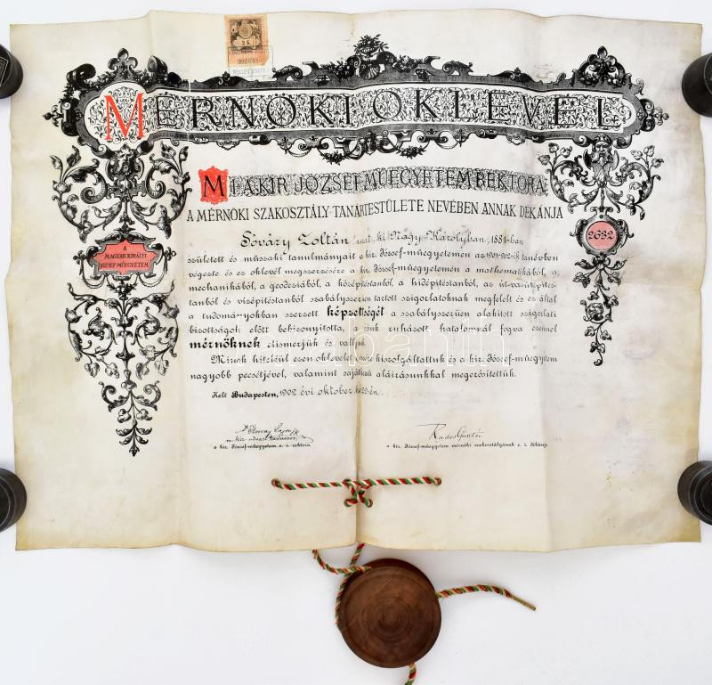 1902 József Műegyetemi mérnöki diplomája nagykárolyi születési személy részére. Ilosvay Lajos (1851-1936) rektor, kémikus, és Rados Gusztáv (1862-1942) matematikus, dékán aláírásaival, pergamen, fatokos függőpecséttel, 2 K okmánybélyeggel, a hátoldalon bejegyzésekkel és további 2 okmánybélyeggel, közte jugoszláv bejegyzések is.