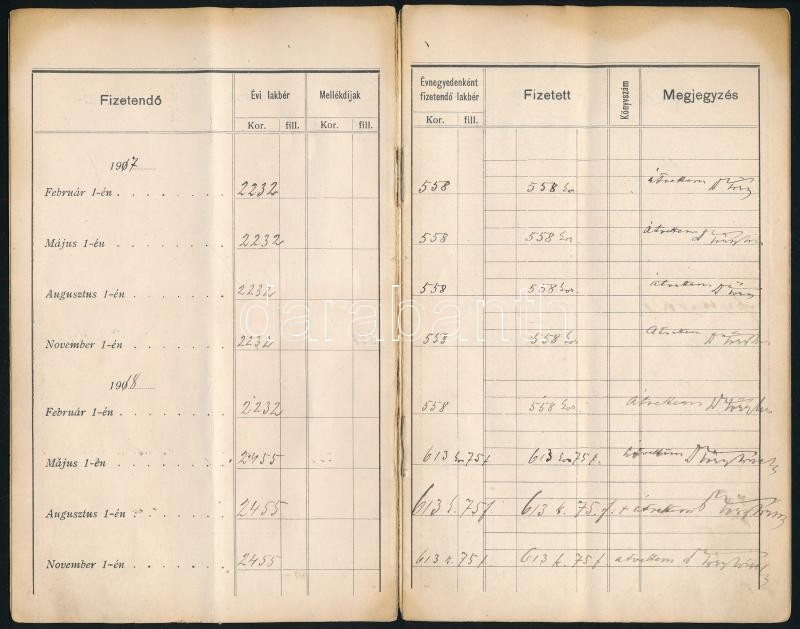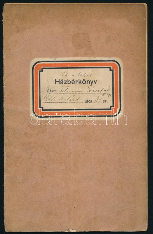 Leírás: 1917-1919 Házbérkönyv, Feldmann Józsefné névre (Bp. VIII., Rökk Szilárd u. 31.), 4 oldalon bejegyzésekkel. Foltos borítóval, kijáró lapokkal.