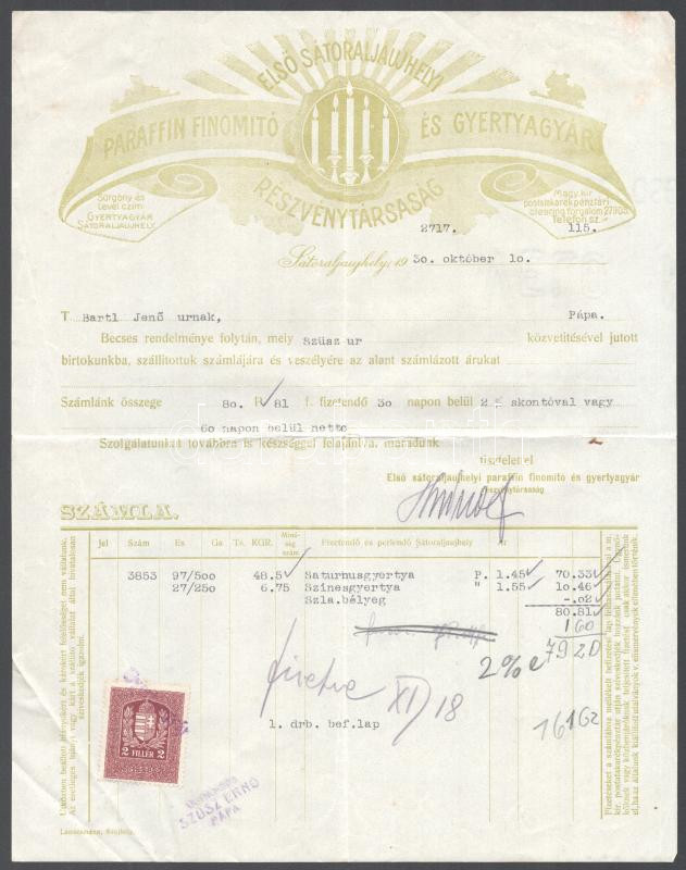 1930 Első Sátoraljaújhelyi Paraffin Finomító és Gyertyagyár R.T. fejlé... https://www.darabanth.com/hu/446-Gyorsarveres/446.0/Mutargy-papirregiseg-egyeb/Okmanyok~500020/1930-Elso-Satoraljaujhelyi-Paraffin-Finomito-es-Gyertyagyar-RT-fejleces-szamla~II2953520