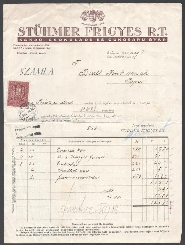 1930 Stühmer Frigyes R.T. fejléces számla https://www.darabanth.com/hu/446-Gyorsarveres/446.0/Mutargy-papirregiseg-egyeb/Okmanyok~500020/1930-Stuhmer-Frigyes-RT-fejleces-szamla~II2953593