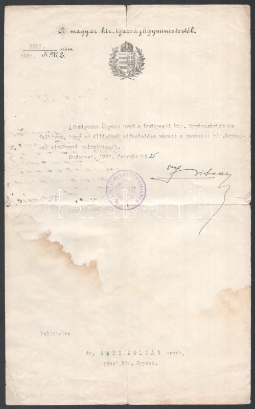 1930 Zsitvay Tibor igazságügyi miniszter által aláírt okirat https://www.darabanth.com/hu/446-Gyorsarveres/446.0/Mutargy-papirregiseg-egyeb/Okmanyok~500020/1930-Zsitvay-Tibor-igazsagugyi-miniszter-altal-alairt-okirat~II2947817