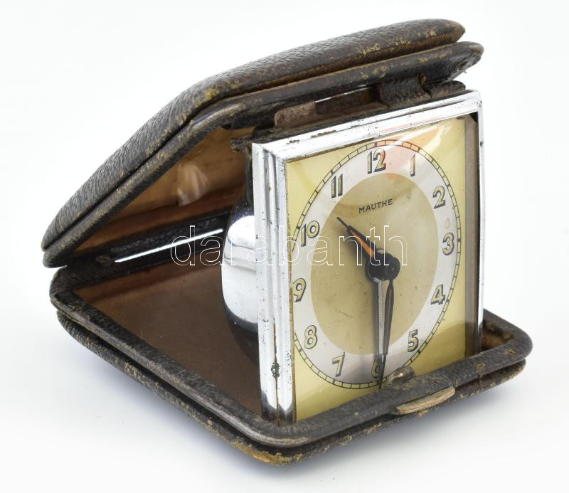 Leírás: Mauthe német utazóóra, kopással, kopott tokban, nem működik