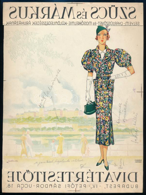 1936 Pál György (1906-1986): Szücs és Márkus divatértesítője, Budapest IV., Petőfi Sándor ucca 18. Art deco reklámterv, próbanyomat. Nyomat, kollázs, papír. Jelzett a nyomaton. Rajta ceruzával írt javítások, javaslatok. 25,5x19 cm
