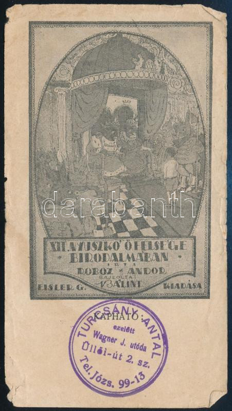cca 1920-1930 Roboz Andor: "XII. Nyuszkó őfelsége birodalmában", könyvajánló számolócédula, rajta Turcsány Antal (Bp., Üllői út 2.) könyvesboltjának bélyegzőjével, szélein kissé sérült