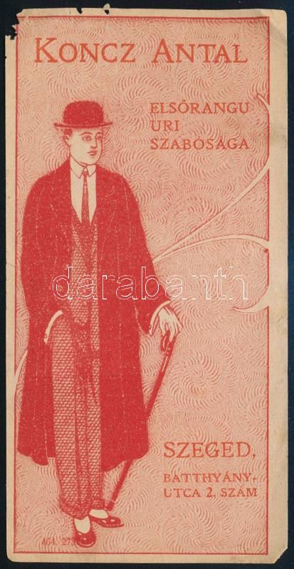 cca 1920 Szeged, Koncz Antal elsőrangu uri szabósága számolócédula, sz... https://www.darabanth.com/hu/446-Gyorsarveres/446.0/Mutargy-papirregiseg-egyeb/Reklam~500024/cca-1920-Szeged-Koncz-Antal-elsorangu-uri-szabosaga-szamolocedula-szelen-apro-serulese~II2954063