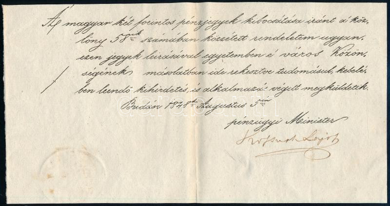 Leírás: 1848 Buda, Kossuth Lajos (1802-1894) pénzügyminiszter autográf aláírása kétforintos pénzjegyekkel kapcsolatos iraton
