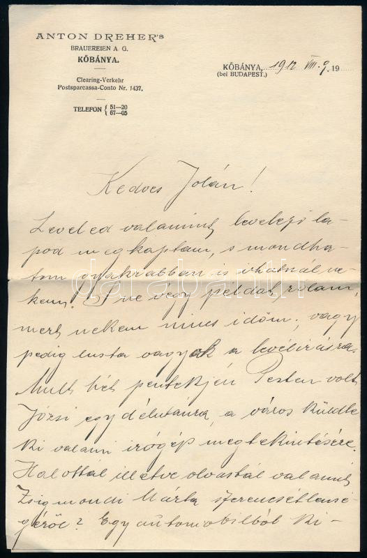 1912 Kőbánya, ismeretlen beszámolója halálos kimenetelű autóbalesetről, amelyben egy hölgy kirepült a gépkocsiból. Három kézzel írt oldal, Anton Dreher Brauereien (Dreher Antal Sörgyára) fejléces papíron.