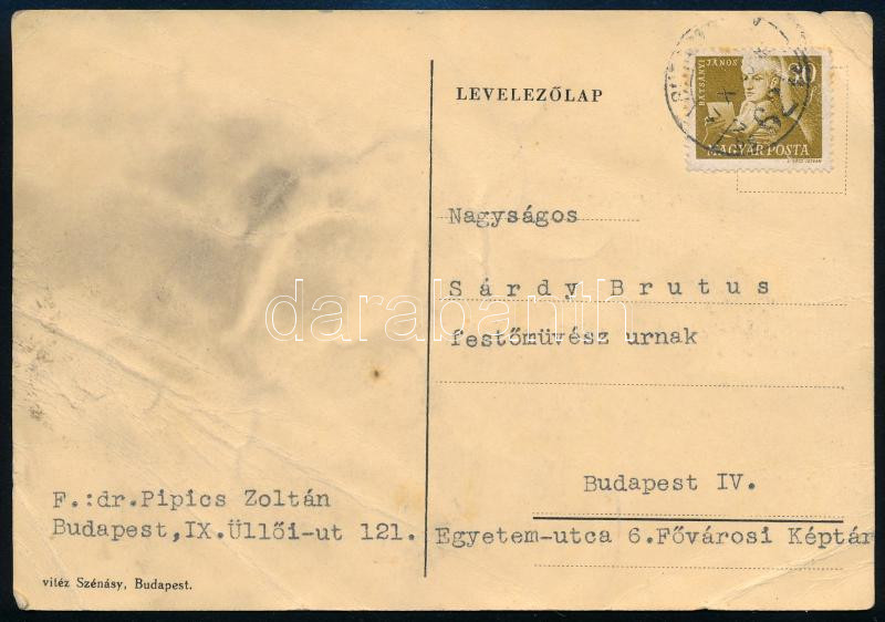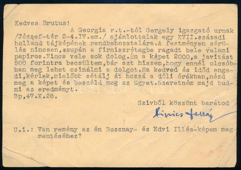 1947 Pipics Zoltán (1900-1975) művészettörténész, az OSZK főkönyvtárosának (1953-1962) gépelt sorai levelezőlapon, Sárdy Brutus (1892-1970) festőművész, restaurátor részére, egy XVII. sz. holland tájkép restaurálásának ügyében valamint érdeklődik, hogy az ő saját Bosznay és Edvi-Illés képei megmenthetők-e? Pipics Zoltán sajátkezű aláírásával, levelezőlapon.
