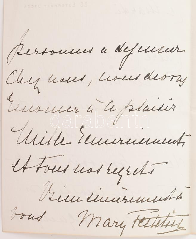 cca 1890-1920 Festetics Mária francia nyelven írt levele, feltehetőleg vagy tolnai herceg Festetics Tassilóné Lady Mary Victoria Douglas-Hamilton vagy lánya (Karl Emil zu Fürstenberg hercegné) Festetics Mária Matild (1881-1953) autográf levele, Mary Festetics aláírással. Fejléces papíron (26 Esterházy utcza (Festetics palota, Pollack Mihály tér 3.), vízjeles papíron "Imperial Treasury De La Rue/DLR (De la rue) korona (Crown)", hajtott, 2 beírt oldal, 2 sztl. lev.
