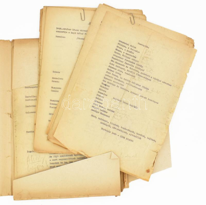 cca 1955 "Gosztonyi János: Colombusz", Gosztonyi János (1926-2014) drámaíró, rendező 1956-ban "Colombus" címen bemutatott színdarabjának forgatókönyve, gépirat kb. 100 oldalon, kézzel írt kiegészítésekkel, javításokkal. Helyenként sérült, foltos lapokkal.