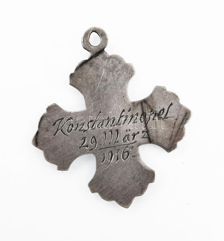 Leírás: Ezüst(Ag) kereszt medál "Konstantinopel 29. März 1916." felirattal, jelzés nélkül, 3,5×3 cm, nettó: 4,5 g