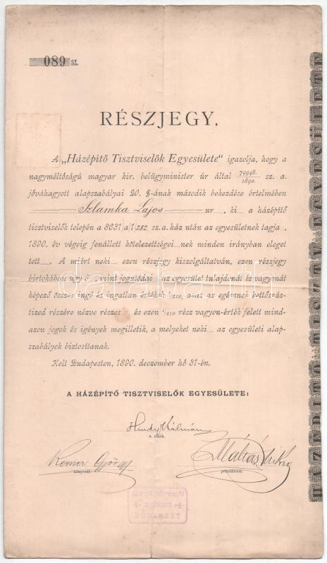 Leírás: Budapest 1890. "Házépítő Tisztviselők Egyesülete" névre szóló részjegye bélyegzéssel T:F