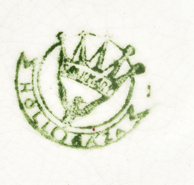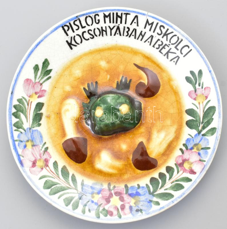 Hollóházi antik humoros tálka "Pislog mint a miskolci kocsonyában a béka" felirattal béka plasztikus díszítéssel, kézzel festett, jelzett, repedt mázzal, d: 14,5 cm