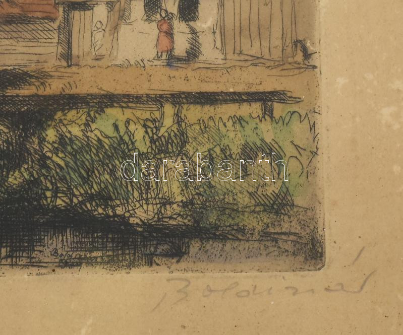 Leírás: Boldizsár István (1897-1984): Fűzfás táj. Színezett rézkarc, papír, jelzett, üvegezett fakeretben, foltos, 20×29 cm