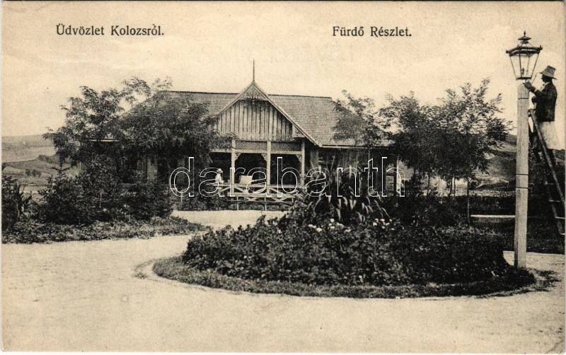 Leírás: Kolozs, Kolozs-sósfürdő, Kolozsfürdő, Cojocna; fürdő, gázlámpa szerelő létrán. Singer Jakab kiadása / spa, gas lamp mechanic working on a ladder