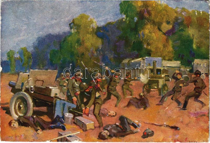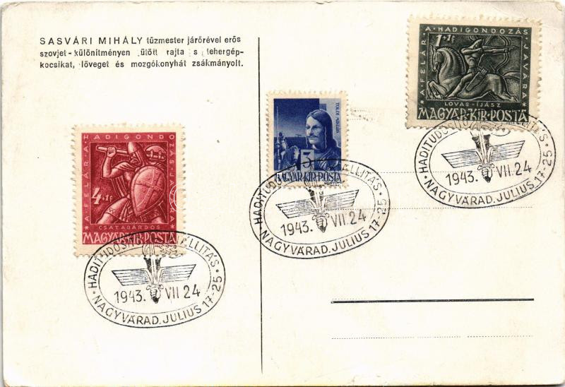 Sasvári Mihály tűzmester járőrével erős szovjet különítményen ütött rajta s tehergépkocsikat, löveget és mozgókonyhát zsákmányolt / WWII Hungarian military art postcard s: Juszkó + "Haditudósító Kiállítás Nagyvárad 1943" So. Stpl. (EB)