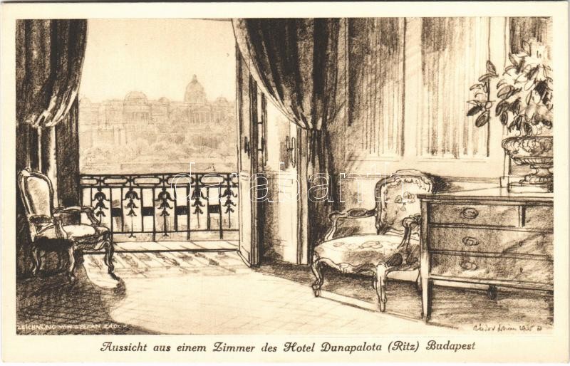 Leírás: Budapest V. Hotel Donaupalast, Dunapalota Ritz szálloda, kilátás egy szobából s: Zádor István