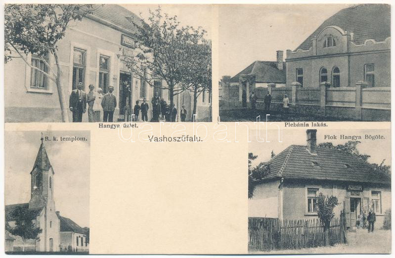 Leírás: Vashosszúfalu, Plébánia lakás, Római katolikus templom, Hangya szövetkezet üzlete, Hangya fiók Bögöte. Kálmán fényirda (ázott / wet damage)